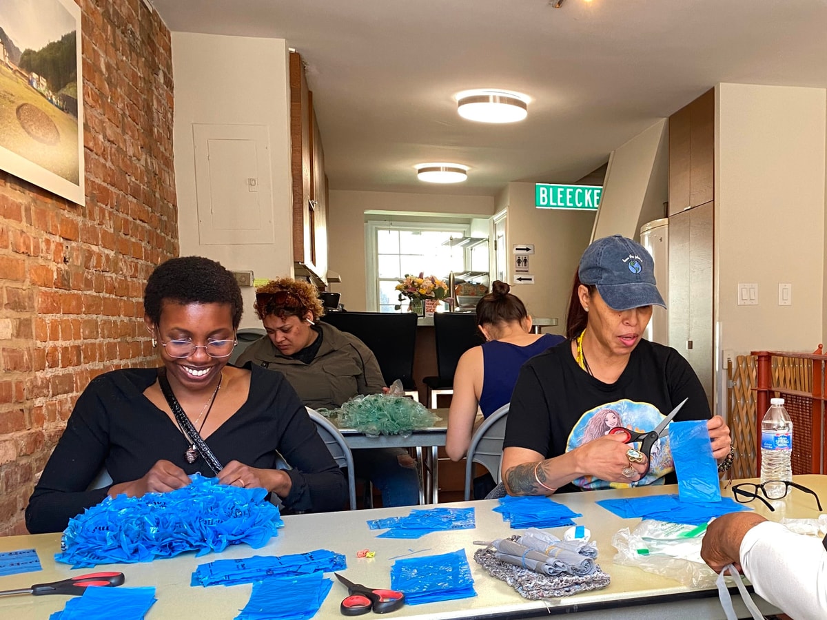This year, The Gleaning Project has expanded our creative output and community impact. We’ve partnered with eight participants—referred by The Salvation Army, Restore NYC, Nora House, All Angels’ Pathways program, and members of our unhoused and immigrant communities—to craft more than a dozen upcycled purses from reclaimed plastic bags. In June, we’ll debut our Chelsea art show, “Coverings: An Exploration of Plastic, Fashion, and Humanity,” featuring these purses as wearable pieces alongside sculptural installations. We’ve also deepened our collaboration with Restore and All Angels’ Pathways to pursue Hope for NY grants to grow our participant base and extend our skills‑building initiatives. We’ve hosted two weekly workshops throughout the year, empowering individuals to transform waste into art while fostering meaningful community building.